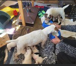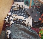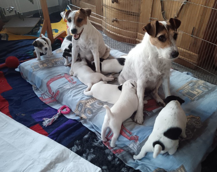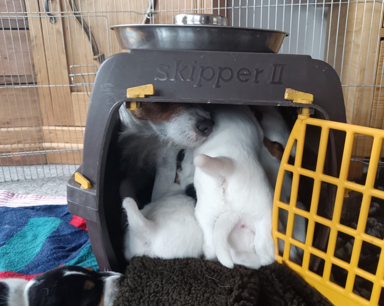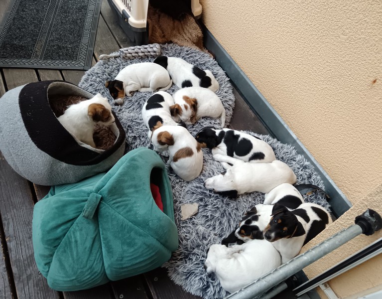 Noch sind beide Würfe getrennt. Lilly wohnt mit ihren Rs im Wohnzimmer, Elli aktuell noch im Büro. In ein paar Tagen werden sie aber auch ins Wohnzimmer ziehen. Wir sind sehr gespannt , wie das wohl wird :-)