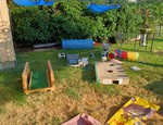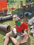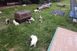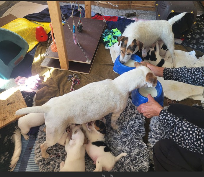 Mittlerweile wurden die einzelnen Appartments mittels Durchgang zusammengführt , so dass die Welpis von einer Seite zur anderen wechseln können. Sie ersten Tage schliefen alle abends noch auf ihren "eigenen" Seiten, aber mittlerweile ist alles zu einer großen WG verschmolzen. Lilly und Elli sind sehr entspannte Mamas und säugen nebeneinander alle Welpen, wie sie gerade kommen; mal "essen" alle bei Lilly, dann ist das Gros wieder bei Elli.... beide Hündinnen nehmen's gelassen. Richtiges Fressen gibt es natürlich auch schon.... die Tage steht die nächste Wurmkur an ...brrrrr....ah ja und Welpenbesuch gab es auch schon :-)